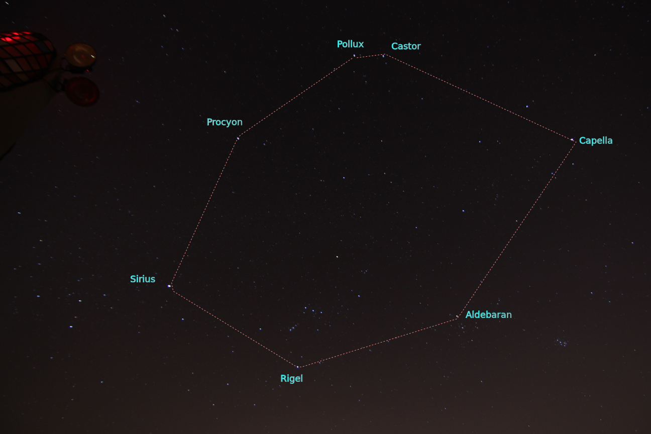 The Winter Hexagon is the common name for a well known pattern of stars (the proper term is asterism) in a shape of a big hexagon which is seen on winter nights. The hexagon is large and all the stars creating it are from different constellations: Pollux and Castor (these two stars are counted as one node) from Gemini (the twins), Procyon in Canis-Minor (the lesser dog), Sirius in Canis-Major (the greater dog), Rigel in Orion, Aldebaran in Taurus (the bull) and Capella in Auriga (the charioteer). Two of these groups: Gemini and Taurus are part of the twelve groups of the zodiac. The stars of the hexagon are bright so you should be able to see all of them even from an urban area.